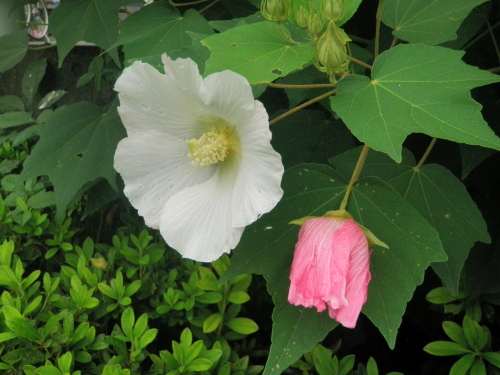 野川沿いの北側にちょっとした植え込みがある。其処に様々な草木が植えられている。その中に芙蓉が咲いている。この芙蓉は朝は白く、暮れ方には紅く染まる。まるでお酒を飲んだようになるので酔芙蓉と呼ばれている。一日花でもう地に落ちている花もあるが、朝に萎んだまま枝にある花もあり、その花を私は二日酔いではないかと思ったりしている。其処のあなた二日酔いになっていませんか。 酔芙蓉などとは粋や雨に濡れ クリックしてね ↓ 人気ブログランキングへ 俳句・秋・植物、芙蓉・酔芙蓉、野川
