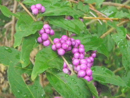 夕方は驟雨に見舞われた。雨は強く降ってしばらくしたら止んだ。植物には恵みの雨で、このくらいな良いが、豪雨に遭われ避難を余儀なくされた方々もおられるので手放しで喜んではいられない。式部の実が紫色を深め実紫らしくなってきた。 紫の雫を結び式部の実 クリックしてね ↓ 人気ブログランキングへ 俳句・秋・植物、式部の実・実紫
