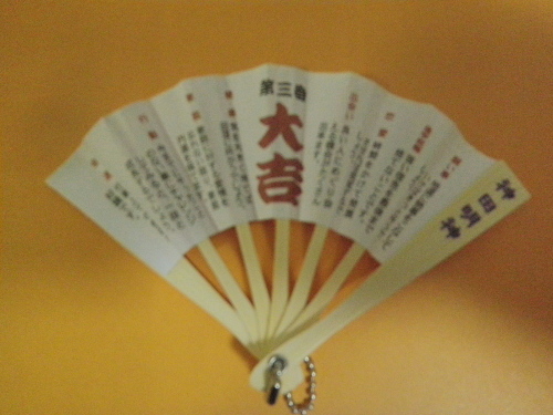 随身門を入って振り返って見ると朱塗りの立派な明るい門が聳え、そして境内は一段と人人人で溢れている。御神籤は扇形でつい引いてみる気になった。どうせ・・・・・と思いながら開いてみるとなんと大吉。こんな些細なことで気分爽快になる。今日は所用があって新宿方面へ。朝晴れていたが急に曇ってきた。雨になるという予報なので傘を忘れないようにと準備した。 初神籤末広がりに書かれあり クリックしてね ↓ 人気ブログランキングへ 俳句・新年・宗教、初神籤、神田明神