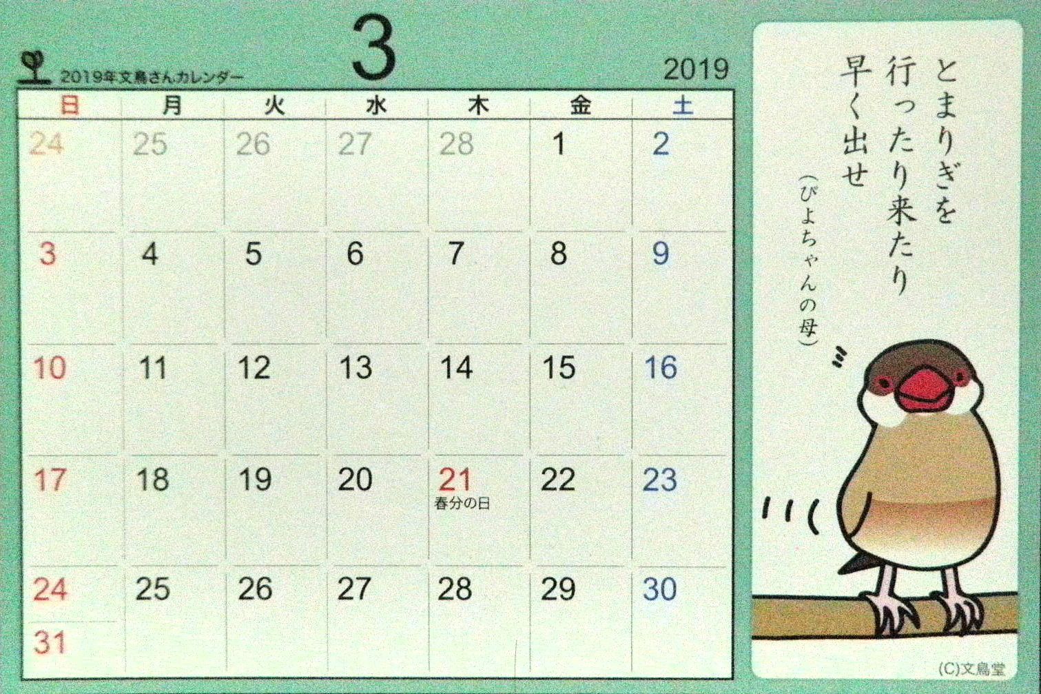 いよいよ待ちに待った三月が来た。昨日は三軒茶屋に用がありカレンダーをup出来なかったので一日遅れとなった。窓外は朝から晴れ渡っているが木々の葉が揺れている。 風あれど日差あまねし三月来 クリックしてね ↓ 人気ブログランキングへ 俳句・春・時候、三月、文鳥さんカレンダー