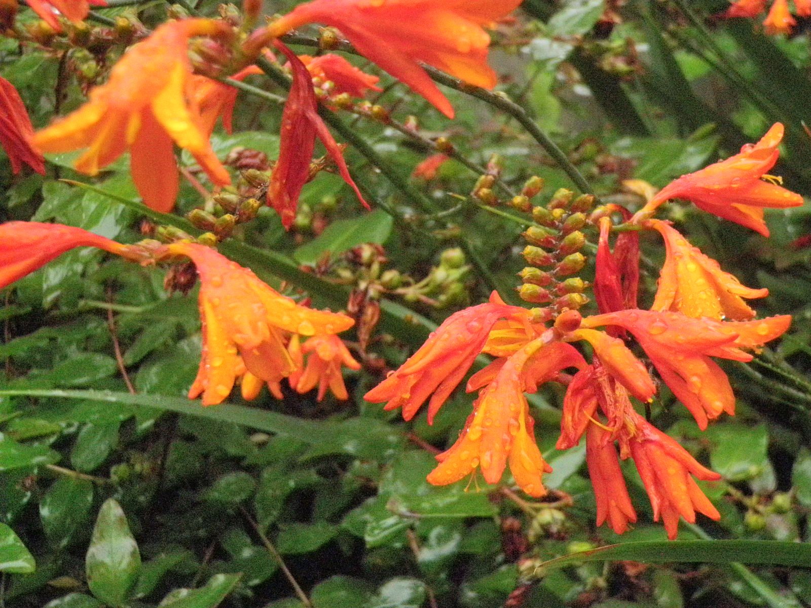 昨日の散歩の時間は雨だったので径を変えて国分寺崖線沿いを歩いた。かっては螢が飛んだ神明の森三ツ池から野川へ注ぐ小さな川に沿って歩いていると檜扇水仙が今を盛りと咲いていた。檜扇水仙はアヤメ科の多年草。夏に6弁の花を多数、花穂につけ、花穂はややジグザグになる。モントブレチアともよぶ。 五月雨や濡れそぼちたる朱き花 クリックしてね ↓ 人気ブログランキングへ 俳句・夏・天文、五月雨、檜扇水仙
