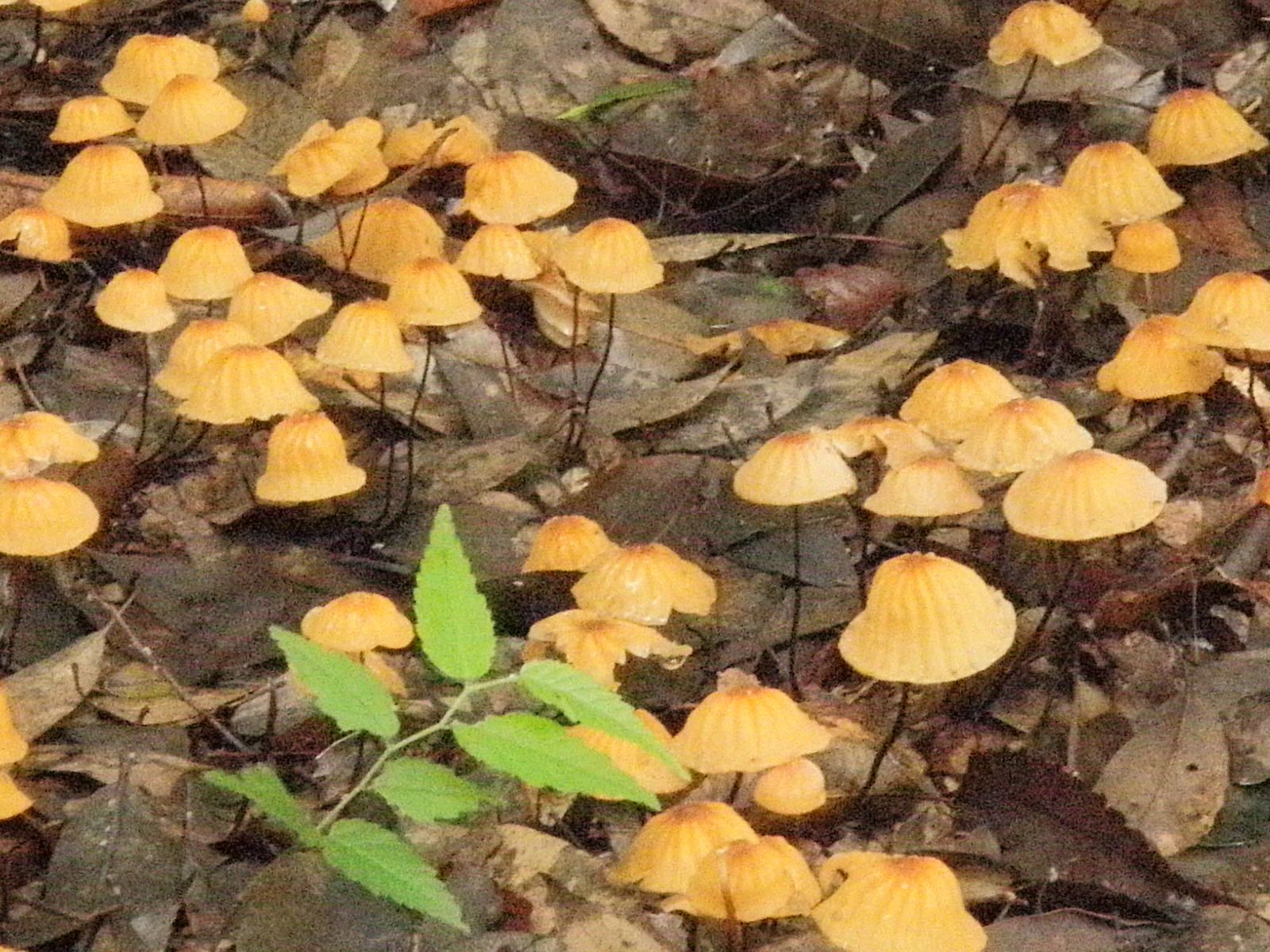 とある杜を歩いていて梅雨茸を発見、渡邉和夫さんのブログによれば針金落葉茸とのこと。なるほど傘は針金が集まったように見え、この茸の回りは落葉を敷き詰めた様に拡がっている。 梅雨茸を数へ数へて二三百 クリックしてね ↓ 人気ブログランキングへ 俳句・夏・植物、梅雨茸・針金落葉茸