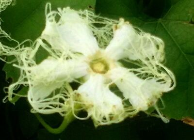 「ウリ科の蔓性多年草。山地に生える。雌雄異株。夏、白色で縁が糸状に避けた美花を夜に開き、晩秋、実が赤く熟す。果肉は荒れ止めの化粧水を作り、種子は薬用・食用。塊根から採った澱粉は天花粉の代用、生薬の土瓜根(どかこん)として利疸・利尿・催乳剤として用いられる。」初めて烏瓜の利点を知って驚いている。此の花を見る度、艶やかな夜会服の様に思うのは私ばかりではあるまい。 夜会服のやうなからすうりの花 クリックしてね ↓ 人気ブログランキングへ 俳句・夏・植物、烏瓜の花