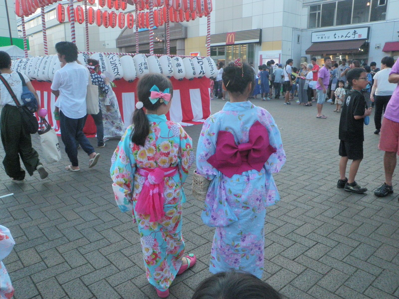 昨日野川沿いを散歩していると浴衣の子を自転車に乗せて駅方面へ向かっている家族連れに出合った。駅近くには太鼓の音がかすかに聞こえてきた。これは見に行くしかないと、駅へ向かった。果たして駅前の北口、南口の広場には大勢の人が集まり、かき氷や綿菓子のテントに列ができていた。踊り櫓も組まれ、踊子(中年の女性)も30人ほど控えていた。中でも少女達の着物姿が美しく目に焼き付いた。 をみな子の髪結ひあげし祭かな クリックしてね ↓ 人気ブログランキングへ 俳句・夏・宗教、祭・商店街祭