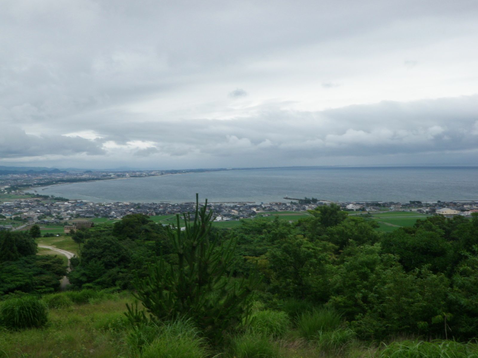 弓ヶ浜妻木晩田遺跡(晴天なれば)次に訪れたのは鳥取県西伯郡大山町妻木115ー4にある鳥取県立むきばんだ史跡公園。入場無料なのがよい。ボランティアの方にガイドしてもらた。この方も無料。 中国地方の最高峰・大山の麓に甦った弥生時代の国邑、それが妻木晩田遺跡です。 遺跡のひろがりは鳥取県米子市・西伯郡大山町にまたがる晩田山丘陵全域におよび、弥生時代 に大山山麓に存在したであろうクニの中心的な大集落であったと考えられます。 現在、全体のおよそ1/10が発掘調査されています。その結果、弥生時代中期末(西暦1世紀前 半)~古墳時代前期(3世紀前半)にかけての、竪穴住居跡約450棟、掘立柱建物跡約510棟、 山陰地方特有の形をした四隅突出型墳丘墓などの墳墓36基や、環壕など、山陰地方の弥生時代 像に見直しをせまる貴重な資料がたくさん発見されました。(とりネットより)入り口の板に頭を打ち付けないように竪穴住居に入る。中は広々(20名位は入れそう)としていて雨が入らないように回りに盛り土がしてある。茅葺きなので、茅に虫がこないように燻す小さな炉があった。息を深く吸い弥生時代の香しい匂いに酔いしれた。四隅突出型墳丘墓は、土で覆われていて、その下に実際の墳丘墓があるとのこと、子どもの小さな四隅突出型墳丘墓もあった。そこを西へ向かって進むと右手に弓ヶ浜が弓なりに拡がっていた。弓の先は美保神社のある美保湾である。晴天なら遙か彼方に隠岐の島が見えるとのこと。この日は海霧(じり)が立ち籠めていて残念ながら見ることが出来なかった。 俯瞰して六月果の弓ヶ浜 クリックしてね ↓ 人気ブログランキングへ 俳句・夏・時候、六月、妻木晩田遺跡、弓ヶ浜