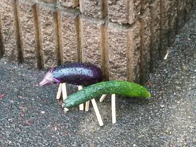 盆棚に供えるため茄子や胡瓜で馬や牛をつくる風習がある。その馬や牛に乗って先祖がお越しになる。我が故郷では門で迎え火を焚き先祖をお迎えし、大文字の送り火で先祖がお帰りになる。とある家の玄関脇に茄子の馬と胡瓜の馬が設えてあった。 茄子の馬胡瓜の馬と寄りあへり クリックしてね ↓ 人気ブログランキングへ 俳句・秋・宗教、茄子の馬