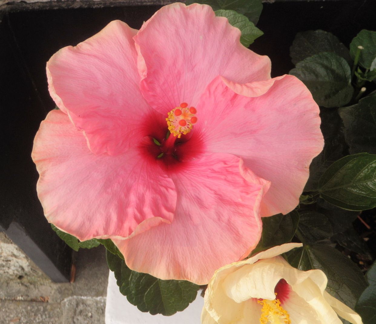 ハイビスカスともいう。アオイ科の常緑低木。大形で木槿に似た一日花をつける。雌しべは長く、その周囲に多数の雄しべが合体している。此の花が咲いているお宅は老齢の男性が車をピカピカに磨いていることが多い。 きのふ白けふはピンクや仏桑花 クリックしてね ↓ 人気ブログランキングへ 俳句・夏・植物、仏桑花