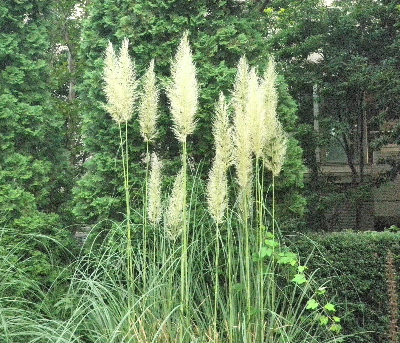 シロガネヨシはパンパスグラスとも言いイネ科の多年草。アルゼンチンの原産。薄に似た長い線形葉を叢生し、大株を作る。秋の初め高さ2~3メートルの花茎を直立、巨大な円錐花序をつける。近くのマンションの庭園で見かけたが未だ茎が細く花も咲きそろっていない。手元の歳時記には載っていないが秋らしい花である。今日で長かった八月も終わる。 八月尽白銀葦の咲きそろひ クリックしてね ↓ 人気ブログランキングへ 俳句・秋・時候、八月尽、シロガネヨシ・パンパスグラス