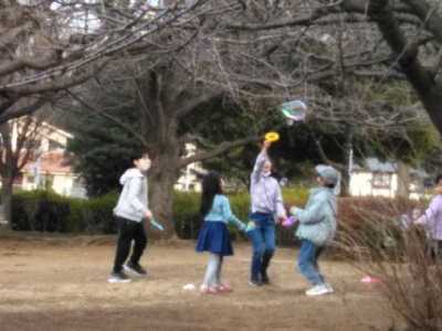 喜多見ふれあい広場は子供達の楽園である。小田急車輌基地の上にある大広場なので、散歩や親子連れ、砂遊び、滑り台、凧揚げなど様々な人で賑わっている。世田谷区の土地でシルバー人材センターの会員が見守っている。トイレも2カ所あり、もちろん入園は無料。最近飲み物の自販機も置かれている。散歩がてら広場に上がってみたところしゃぼん玉で遊んでいる子供達をみかけた。今頃のしゃぼん玉は石けん水をストローで吹くのではなく、プラスチック製の器具で飛ばすのでご覧のようにしゃぼん玉も大きい。 石鹸玉見上げる子らの声弾み クリックしてね ↓ 人気ブログランキングへ 俳句・春・人事、石鹸玉・しゃぼん玉