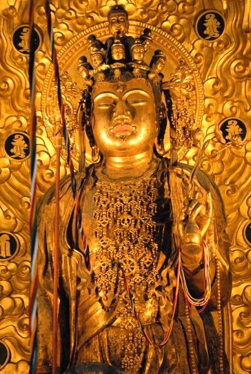 長谷寺は白梅紅梅が咲き乱れ、池の端には赤い野点の傘が立ち艶やかな景色を醸しだしていた。長谷観音はご覧のように金色の色を放ち下から見上げてその尊いお姿を排した。