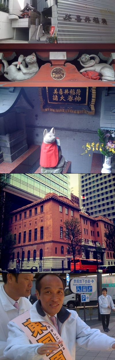 赤坂見附の美喜井稲荷。駐車場入口の上にあり、2名も敷地に入れば満員の狭さ。しかも『狐』では無くて、『猫』。不思議で気に入ってます。東京の日本工業倶楽部会館。高層ビル足元に歴史を感じる空間♪東国原氏が近付いて来たので、シェイクハンドしましたが、残念な結果でしたね。サッカースタジアム本日動画旅先画像薪ストーブ黒柴犬GALLERY農業をやろう