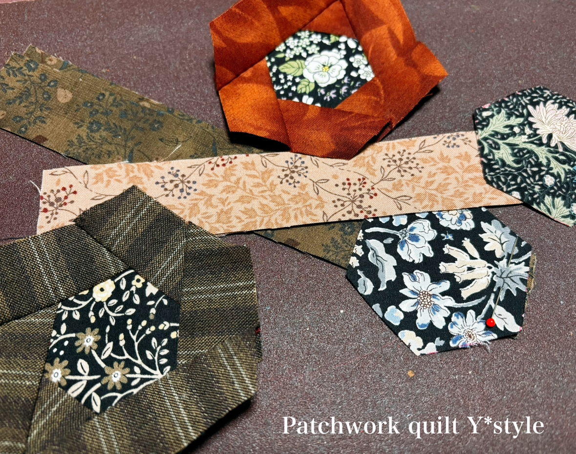 ヘキサゴンのログキャビン(一周だけ)のピースを混ぜて縫い合わせます。