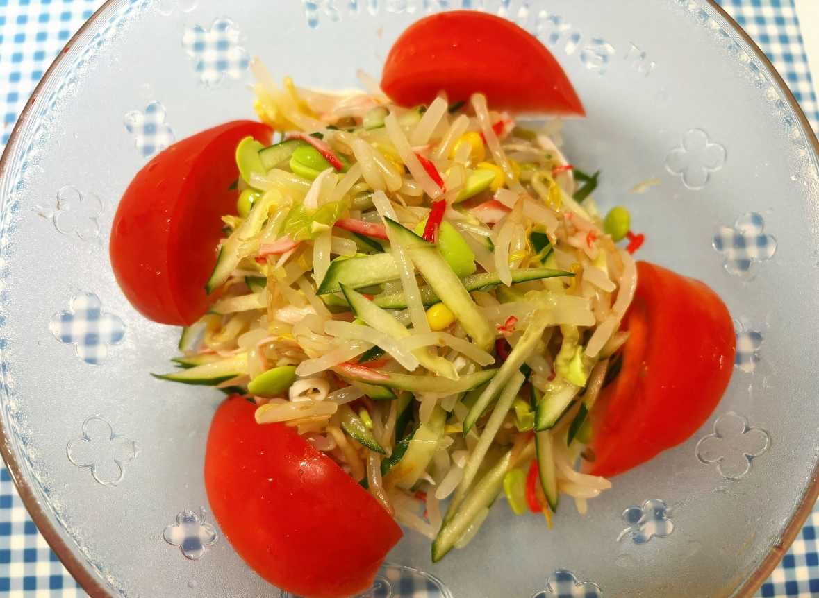 もやしとコーン,枝豆、きゅうりとトマトです。
