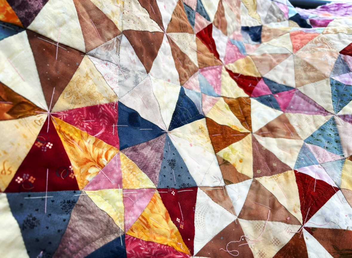 最近、いろんな作品制作を同時進行させてますがまたひとつ増やしてしまいました!!資格取得のための講師科課題でトップ完成後、セッティングして、一度キルティングを始めたものの、気に入らなくて全て外し、その後少しキルティングしてましたが再度押し入れの肥やしになっていた作品。あまりにも可哀想で、そして、心なしか色褪せてきてる気もして、今完成させなければさすがにまずい(⌒-⌒; )となっていました。今日は一日、ゆっくり制作できる日なので、再開。このパターンはいろーーんな形が見えてくるので、キルティングラインを考えるのが楽しい作品です。キルティングのやり甲斐がありますよ〜。今日の成果はこちら。小さな濃い八角形の中にお星様を浮き立たせるようなラインにしました。ここからさらに内側に丸いラインを入れようかと思います。今日は、このキルトの他に今手掛けてるものを一通り進めていきます。あとひとつ、作り始めたいものがあり、図案を描いているところです(*´꒳`*)さてさて、どれが一番先に仕上がるか??シンブル各種 コインシンブル 皮シンブル 金属製シンブル ラバーシンブル 貼るシンブル クロバー パッチワーク キルティングみなさんはキルティングする時、どんなシンブルを使われてますか?私は中指の第二関節まで入れられるコインシンブルと、親指か人差し指にラバーシンブルをつけて作業しています。自分に合ったシンブルを見つけられたら、制作も捗りますね( ´ ▽ ` )最後まで読んでくださり、ありがとうございました。オーダー品、レッスン依頼などYstyleゆうへのコンタクトはこちらから↓ ↓ ↓コンタクトはこちらからどうぞ╰(*´︶`*)╯ブログ村のランキングに参加しています。応援クリック!よろしくお願いいたします(*´꒳`*)にほんブログ村にほんブログ村