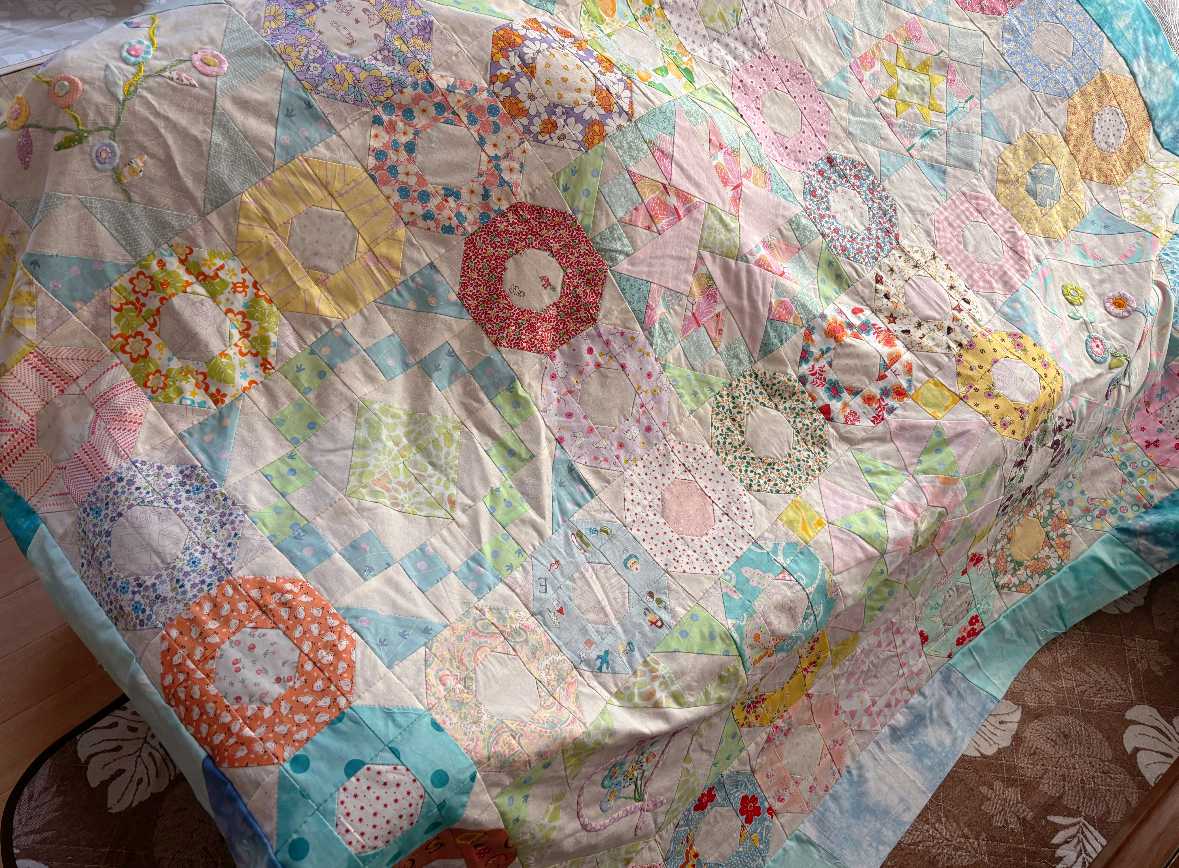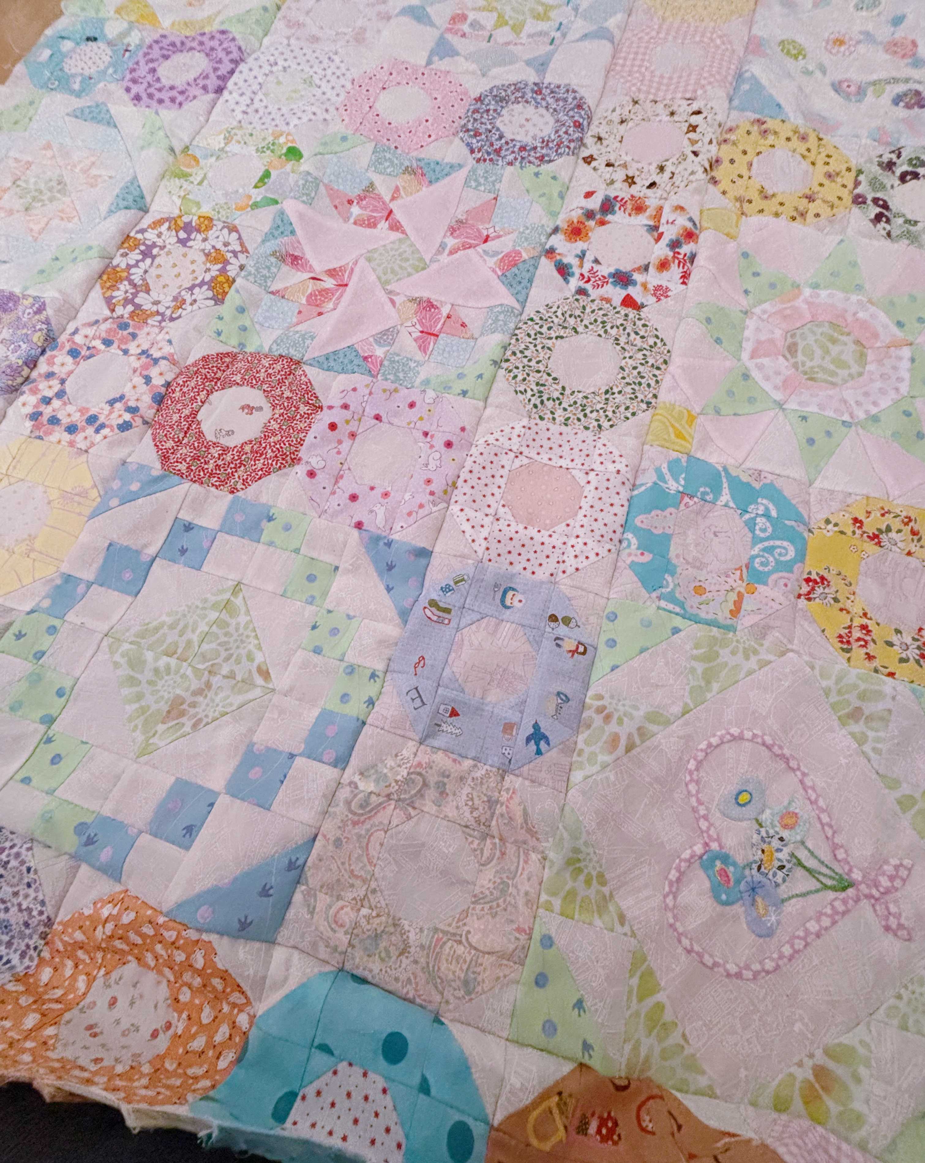 今日もお天気良かったですね〜。エアコンつけなくても大丈夫な日もちらほら。秋に向かってて嬉しいです。昨日、ソファーカバーのパターン全て繋ぎ終わりました。楽しかった〜。サイズは140cm角です。刺繍とアップリケパターンもバランスよく配置できました。28センチのパターンを囲むように、14センチのドーナツパターンが入ってて、ドーナツパターンの方を浮かせてます。これから、ここに断ち切り10センチ幅のブルー系の布をランダムに繋ぎ合わせてボーダーにしてキルティングを始める予定です。出来上がりはおよそ160センチ角くらいかな。そんなに大きくないですね。裏布は、ずっと前に林檎さん宅にソファーカバーを作ってあげようと思って買っておいた生地があるのでそれを使う予定です。明るく可愛い配色なので、孫っちたちが遊びにきても楽しんでくれるかなーと思いながら進めようと思います。最後まで読んでくださり、ありがとうございました。オーダー品、レッスン依頼などYstyleゆうへのお問い合わせはこちらから↓ ↓ ↓お問い合わせ等はこちらからどうぞ╰(*´︶`*)╯ブログ村のランキングに参加しています。応援クリック!よろしくお願いいたします(*´꒳`*)にほんブログ村にほんブログ村
