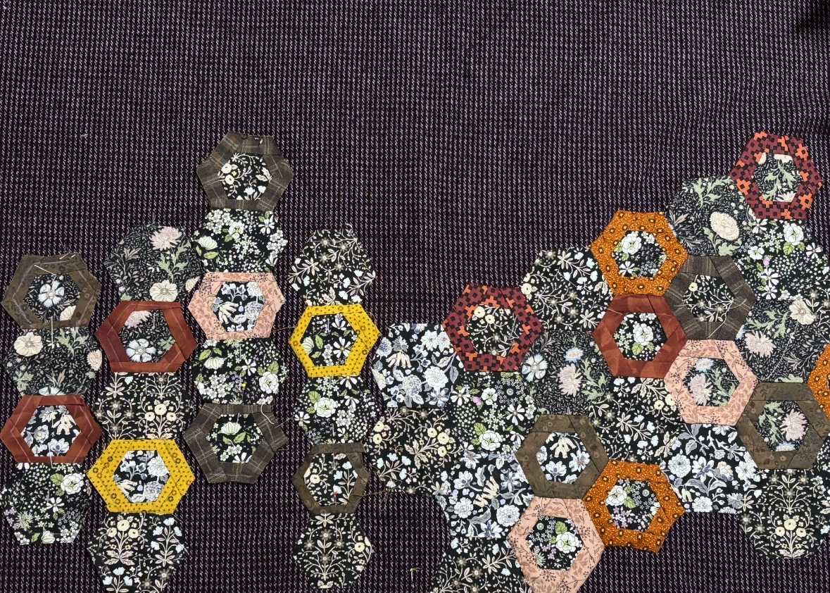 今日は、午前と午後でフリーの生徒さんのレッスンがありました。体調がやっとよくなってきて、レッスンできて良かった〜\(^o^)/です。午前中は、ハロウィン柄のパックンポーチとお正月のフレーム作品、そして、ワンショルダーのバッグ。こちらは残念ながら写真撮りそびれです…午後は、大きめの縦長バッグです。もう少しでトップ完成です!ピースワークしたヘキサゴンをベース生地にアップリケしています。左半分と右半分で表と裏になります。キルト芯は入れず、接着芯だけを貼り、内袋を合わせて仕立てですね。今日、悲しいことにミシンが壊れてしまいました。長年、酷使してしまっていたので、もう充分働いてくれたので、ご苦労様でしたといいたいんですが、長年使い方に慣れてるミシンとさよならするのはほんとに悲しいですよね。どうしたものか。しばらく考えます。簡単なものは当分林檎さんのミシンを借りよう!!生徒さんたち、今年の酷暑もなんとか乗り切ってくださったようです。これからキルティングも捗りそうな季節になりますよね。みんなでチクチク楽しみましょーね!!最後まで読んでくださり、ありがとうございました。オーダー品、レッスン依頼などYstyleゆうへのお問い合わせはこちらから↓ ↓ ↓お問い合わせ等はこちらからどうぞ╰(*´︶`*)╯ブログ村のランキングに参加しています。応援クリック!よろしくお願いいたします(*´꒳`*)にほんブログ村にほんブログ村