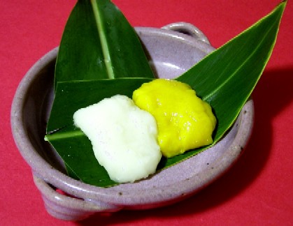 沖縄では毎年、旧暦の12月8日(今年は今日、新暦1月7日)にムーチーを食べます。ムーチーとは餅(もち)のこと。鬼ムーチーともいいます。 ムーチーのつくり方は⇒ここをクリック鬼ムーチーの伝説は⇒ここをクリック 2月には東京に出張して、伊勢丹新宿店で開かれる「沖縄美味物語」という催しに出店します。2月15日(水)~21日(火)午前10時~午後8時・地下1階 提供する商品は、「琉球宮廷料理七彩箱」(2人前・2000円)「おきなわ花ちらし」(1人前・1000円)「ラフテー」「アシティビチ」その他です。お近くの方はぜひ、お立ち寄りください。 2006年もよろしくお願いします。 にんじん食堂・実方藤男〒901-2225沖縄島宜野湾市大謝名3-12-2TEL&FAX 098-897-5083togenuki2003@abeam.ocn.ne.jpninjin5083@ybb.ne.jpにんじん食堂HPはここからどうぞ去年も楽天仲間が買いに寄りとてもおいしいと好評でしたね!繁盛していそがしそうだったとの情報が寄せられていましたね!今年もおいしい料理でみんなを幸せにしてくださいませ応援していますよー!にんじん食堂さんはおいしい沖縄料理の本もだしていますこの本でいろいろな料理を自分でもつくってみませんか?カラフルで綺麗な本でよだれがでます(^^)*なお今日ここのページに使用している写真はにんじん食堂さんからのお知らせメールから転載させて利用させていただきました(著作権はにんじん食堂さにありますことをご案内申し上げます)