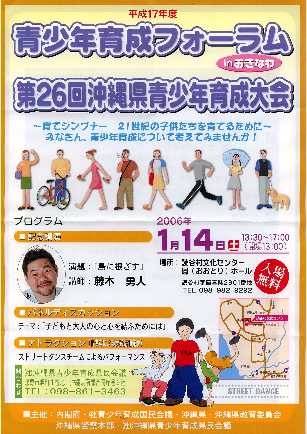 「大好き沖縄」新年会にご参加いただいた皆様ありがとうございましたたくさんの笑顔に心暖まる良き新年になること間違いありません(^^)出会いこそ宝物です東京へいっている間日記が更新できずすみませんでしたm(__)mさて「大好き沖縄」をいつも応援してくれている琉球舞踊の先生である植竹しげこさん(在東京)が5月13日(土)に藤木勇人さんを迎えて「沖縄のこころ」と題した沖縄返還(復帰)記念公演を企画しました藤木勇人さんの一人芝居や植竹しげこさんの舞踊などで沖縄の心感じてくださいませ(^^)在東京の皆様今から予定にいれて是非ご観覧くださいませ問い合わせ(チケット等)042-91-0283(植竹)まで入場料は前売り3000円(当日3500円)会場は BX ホール(全席自由)=========================-また藤木勇人さんは沖縄では今週末1/14に読谷村で青少年育成大会で講演します在沖縄の皆様こちらは入場無料ですので「島にねざす」と題した藤木さんのお話を是非どうぞ午後1時開場 読谷村役場となり 鳳ホールです*新年会の様子などはまた写真を整理して報告します