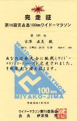 世の中にはマラソン病もあるようです(^^)去年から沖縄病に併発したマラソン病の管理人ですがいつのまにかチームに所属ししっかり走る楽しみを味わっていますそんなマラソンランナーにとってトライアスロンよりも強靱な精神と体力と気力を必要とする「宮古島100km」マラソンにいってきます仲間は100kmを走ります正月の走り初めで準備した?というものの練習不足で私はどうななるかーー20km完走が目標ですしかしー出かける前にも仕事だらけで寝不足ーー明日あさっての日記も心配ーーーながらとにかくblogで随時宮古からをお届けしますのでお許しを!メダルをもらって(完走メダルですよー)写真とってビール、泡盛で乾杯ーしてとすでにゴールを楽しく想像してます今回の宮古島2006年の初レースだもん(^^)ワイドーしてきます”!*ワイドーは宮古方言那覇方言になおすとチバリヨーで標準語ではがんばりまーす!ですでは朝宮古へ飛びます!