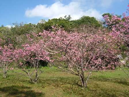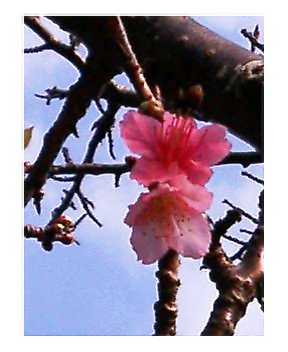縁起良いナー(^^)2006もうやんばるではもちろん桜が咲き出してるんですけど私は近所で(宜野湾市)でみつけた!とっても嬉しくて携帯で撮りました!沖縄は桜祭りは毎年1月から始まります北部から咲き出して南部が最後というのが南下する咲き方をするのが沖縄の桜なんですが宜野湾で咲き出したてことはもう今年の春は近いかも(^^)沖縄の濃いピンクの桜は案外長持ちするので是非見に来ませんかー(^^)!