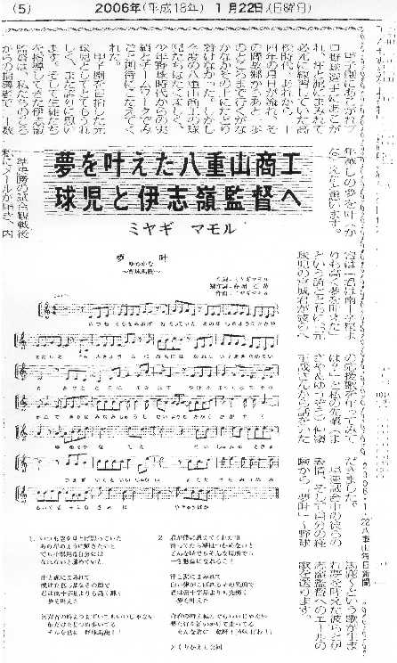 今日の八重山毎日のコラムに歌手のミヤギマモルさんの「夢叶」の八重山商工応援歌の楽譜とエピソードがでました元球児のミヤギマモルさん故郷のチームの活躍に思いをこめた作品にきっかけ話しが掲載されていました実家からいち早くFAXが届き伴侶が外出中なので私が先にUPすることにしました伴侶はミヤギマモルさんにほんの少しながらきっかけを作ったようです同じ石垣出身同士でミュージシャンでと通じるものがあったんでしょうね離島の石垣島から甲子園へという思いは2005年私も実際浦添球場で試合をみて鳥肌したぐらいですから(^^)どんな歌になっってるのかな聞いてみたいな(^^)甲子園にむけて2006年夢叶うその時はもうすぐでしょうね!ちなみに感動の大会観戦日記は下記です11/20八重山商工試合観戦日記