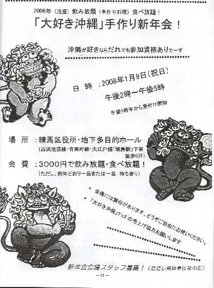 1/9はたくさんの皆様のご参加ありがとうございました「大好き沖縄」は年4回の発行で現在32号まできました すべてが投稿の皆様のお便りが命の本として今時、珍しいーこのような手作り雑誌への応援&参加にいつも感謝しています私も沖縄支部長としてすでに5年が経過しましたが書店で買えない本を通販や手売りでPRすることの難しさや時代のネット、blog化の反対側に位置するような雑誌ですが世の中はネットやblogに全然関知せずに生活を楽しまれる方もいらっしゃることが沖縄好きに多いことも編集部には大きな支えとなっていて感謝していますまた私個人や楽天HP等の素晴らしい繋がりで友情が芽生えたりと交流の素晴らしさにも感謝していますさー写真は我が妹分のSATOKOが撮ってくれましたのを紹介しながら報告でーすまずは恒例看板は毎号の「大好き沖縄」の表紙の万国旗風でーす(^^)カラフルでしょう!料理は愛情込めた沖縄材料なども工夫したものがテーブルいっぱいでましたーそして今年も石垣出身のみなさんがすばらしい団体演技を衣装もそろえて披露してくれて感激!!ありがとうございました!! とにかく演目も多く今年は三線披露の方もたくさんいて賑やかになり楽しくあっというまでしたあいかわらず私はばたばたしてみなさんと話しをする時間がとれず大変申し訳なかったのですがお約束?!の隠し芸?は披露させていただき習って半年の沖縄古典笛いかがでしたかね(^^;) 三線はわらぶーの井上さんとしっぱちゃんと友人に支えられて踊りは植竹先生が華やか演舞くださり感謝感謝でした!!また、たくさんの皆様からのお土産にも感謝でございますたくさんの他にも写真なども届きしだい大好き沖縄のほうのHPで今後紹介しますのでしばしお待ちくださいませ出会いに感激感謝で2006年も良いスタートとなりました有り難うございマース!