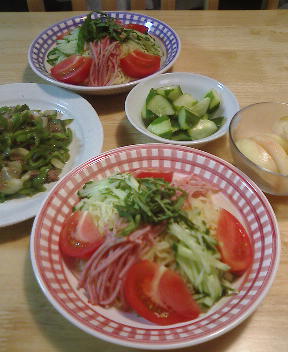 今晩は冷麺とピーマンとひき肉のチンジャオロースー、キュウリの浅漬け、デザートは桃暑い夏になると、作るほうも食べるのも、大変!するするっと食べれるもの、ばかりを好んで作ってしまうんですよね~本当はもっと栄養のあるものを作らなくてはと思うのですが・・・このキュウリの浅漬け。店頭の出来合い「あさづけの素」でつけたものではありませんよ~あれもつけこむだけで簡単ですが、作るのも簡単なんです題して!づっち~の「きゅうり和風ピクルス」1、キュウリはところどころ皮をむいて、乱切りにしておきます。2、耐熱ボウルに酢大2・砂糖大1・薄口しょうゆ大1分の2としょうがの摩り下ろしたもの(千切りしたものやチューブのものでも可)をいれて上下ひっくり返すように混ぜ混ぜ。3、ラップをかけて、電子レンジで2分半チン!4、ラップを外して、粗熱をとって、冷蔵庫で冷やしてできあがりビールのお供に最適です。ただ、ダーは大きなままのキュウリが苦手で食べれないので、私が全部食べちゃいましたが・・(・・;)暑い想いもせずに、楽チン簡単ですよ^^ぜひ、お試しあれ~~