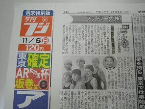 妙齢(でもないけど)の女性としては夕刊フジをレジに出すのは多少のためらいがありましたが...11/5夕刊フジ買いました!的確に、かつ丁寧に取材してくださってあって感動。いろいろなタイプの雑誌や記事にしていただいていますが、同じ事柄でも記者さんの個性によって視点が違うのには毎回驚きます。「こういう面って新鮮なんだなあ・・」って・※毎日触れている商品や話題っていつの間にか 自分たちにとってはアタリマエのことになってしまうものです。もちろん、記者の方々はいつも新鮮な目線・変わった切り口で物事を捉えるようになさっている事でしょう。しかし私たちも毎日の出来事に慣れてしまわず、どんな点がお客さまにとって便利なのか・他社製品との違いについてなどなど、お伝えできるように鮮度の良い目線を持たなくては。なんて思ったのでした。--ベビー水着 機能性水着 うきうき屋店長@フットマーク◎今週の店長オススメ:美骨&美脚を目指せ『歩行楽らくタイツ』 詳細パンフ請求は→ココからお気軽に♪http://www.footmark.co.jp/無料で詳細なチラシをさし上げます。チラシには限りがございますのでお気軽に&お早めにお申し込みくださいませ~。宛先:tencho @ukiuki.jp件名:「フィール・アライナ」カタログ請求 うきうき係本文:ご住所・お名前・電話番号・ご希望枚数(基本はお一人様1枚です)