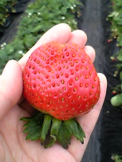 お休みを戴いて家族旅行にきています。今日の主な目的はイチゴ狩り。(初めてなんです♪)見てくださいこの巨大さ!!!!大きくて形のよいのが甘いイチゴだそうです。平日で、雪が降るとの予報もあり、東京ドームほどもあるイチゴ畑は人影がほとんどありません。おかげで家族3人(お腹の子も入れて4人)でハウス一棟貸し切り状態♪食べ放題♪甘くて大粒のいちごから順番に選んで食べられるという贅沢をしました。しかもお腹いっぱいになって、お昼ごはんが入らなくなるくらい。おそらく、一人で3・4パック分食べたでしょう...(結局お昼ごはんは食べませんでした)受付のおばちゃん曰く、「明日明後日は休みだから、バスと車とでスゴイ人出になるよ! ゆっくり食べてなんていられないから 平日がいちばんイイよ!」そのことは、心より実感しました。るるぶ.com 全国いちご狩りスポット2006 >JAはが野益子観光いちご団地ちょっと平日ムリしても家族でゆっくりできる方がきっと思い出に残ると思います。小さなお子さんをお連れなら、なおのこと!お隣のハウスからは3才くらいの女の子が一粒とってはパパに見せに走り回っている音が聞こえました。土日ではそんなことはできないでしょう...--ベビー&マタニティ水着・水泳&健康グッズうきうき屋店長クボタ@フットマーク