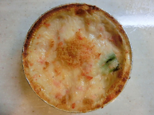 2品目。別のものを買っていたのですが、帰る途中、有楽町ルミネ内のDEAN&DELUCAの前を通ったら、美味しそうなグラタンが目に止まったので、買ったものは冷凍して、そのグラタンを買って食べてみることにしました。それがこちら。蟹と下仁田葱のマカロニグラタン。14時ごろに焼きあがるグラタンだそうです。いつももっと早い時間に通っていたので知りませんでした。側面です。アルミカップに入っていました。内容は、蟹、下仁田葱、ペシャメルソース、マカロニ、チーズなんですが、蟹があまりにも少なそうだったので、おうちにあった紅ずわいがにの缶詰を更にトッピングしてマシマシ状態に。それをオーブンで温めなおしました。温めるとソースがぐつぐついって、とっても美味しそう♪では、実食!!内部です。マカロニと葱がたっぷりと入っていました。 アップです。葱が結構入っていました。蟹は増量したので蟹たっぷり♪やっぱりこれぐらい入ってないと寂しいですね。食べてみると、滑らかな口当たりのペシャメルソースで、結構あっさり仕立て。アメリカーンなお店のお惣菜なので、コッテリ濃厚なのかな、と勝手に思っていたのですが、全くもってそんなことはなく、コンビニのグラタンよりも軽やかでした。葱が大振りにカットされていたので、葱のシャキっとした食感がよく、マカロニもほどより量で、大きさも考えると副菜として添えるぐらいがちょうどいいかな。もしくは、あと一品足すとか、そんな感じでした。蟹はそのままだとやっぱり少なーいって思う量でしたが、自分で増量したので、蟹の風味と味わいがしっかりと出てよかったです。重たさがないグラタンだったので、食べやすくてよかったです♪新しいキッシュも登場していたので、また買いに行こうと思います。さて、明日は久しぶりのチキンライスにパフェ♪楽しみだな!!