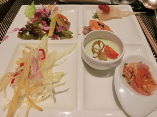 夕方にちょっと怪しげな雲は出たけれど、それほど気温も下がらず、過ごし易いお天気だった一日。この週末はそれなりにお天気に恵まれてよかったです。鳥取の地震の被害も心配ですが、東京も大丈夫かなあ、とまた不安が・・・。平穏な日々でいて欲しいです。そんな中、恒例のお食事会にお出掛け。今回向かったのは、竹芝にあるインターコンチネンタルホテル 東京ベイ内のシェフズライブキッチン。何度か利用したことのあるブッフェです。今回新高輪とどちらにしようか悩んだのですが、こちらの方が食べられるものが多いようだったので、久しぶりにこちらを利用することにしました。お店がオープンして、予約名を告げると、ソファ席の大きめの席を用意してくれて、ゆっくりと食事ができそうです。が、席に着くと、「今日は団体のお客様が入っておりますので、込み合う前にお料理をおとりになっておいてください」と言われたので、それは大変!!その団体が到着する前に、混んだらなかなか取れなさそうなものから先に取ることにして、いざ、ブッフェ開始です!!お料理一皿目。左上から時計回りに、生ハムと食用菊(かきのもと)と秋野菜の贅沢サラダ、カラスカレイと新潟野菜のバプール、ジンジャーソース、酒粕でマリネした銀鮭のポワレ、新潟産五穀米リゾット添え、枝豆のブランマンジェ、カリカリ美人蓮根と共に、銀鮭の焼き漬け、甘酢ソース、青パパイヤとキアヌのサラダ。生ハムと食用菊(かきのもと)と秋野菜の贅沢サラダは「生ハム、新潟県の食用菊(かきのもと)と秋野菜を、贅沢にサラダに仕上げました」との事で、サラダらしいもの。生ハムはしっとりで、まあ普通。ラスカレイと新潟野菜のバプール、ジンジャーソースは「カラスカレイと新潟野菜を甜醤油(テンジャンユ)ソースで仕上げました。とろみのあるソースがカレイ、野菜との相性がピッタリです。」とのことで、さっぱり、あっさりなカレイにこのピリッとしたソースがとてもよくあっていました。酒粕でマリネした銀鮭のポワレ、新潟産五穀米リゾット添えは「銀鮭を酒粕でマリネして、五穀米リゾットを添えてヘルシーに仕上げました」とこの事で、銀鮭の脂がのっていてふっくら♪お醤油ベースのソースが和の感じが出ていてよかったです。枝豆のブランマンジェ、カリカリ美人蓮根と共には「ポタージュスープを食べている様な食感と味わい。新潟“五泉美人”を添えて」との事で、洋風プリンみたい。スープよりも食べやすかったです。銀鮭の焼き漬け、甘酢ソースは「銀鮭を甘酢ソースに漬け込み、焼き漬けにしました。」との事で、甘酢のさっぱり感がちょっと洋風が多いお料理の中で、口直しになってよかったです。青パパイヤはシャキシャキとした食感で、少し生のかぼちゃみたい。キアヌも入っていて、ヘルシーなサラダでした。お料理二皿目。同じ順序で、天ぷら、じゃが芋と食用菊(かきもと)のチーズグラタン仕立て、新潟名物“越乃黄金豚”タレカツ シェフズ ライブ キッチンスタイル。天麩羅(海老、舞茸、ナス、一夜干しイカ)はその場で揚げてくれるので、揚げたてアツアツ♪天つゆもありましたが、私はカレー塩で食べました。じゃが芋と食用菊(かきもと)のチーズグラタン仕立ては「新潟産の食用菊〈かきもと〉を使い、シャキシャキジャガイモの千切りをあわせてグラタン仕立てにしました。」との事で、マッシュしたものやスライスしたジャガイモのグラタンはよくありますが、千切りタイプのは初めて!シャキシャキした食感が残って、こういうグラタンも美味しいなあ、と思いました。新潟名物“越乃黄金豚”タレカツ シェフズ ライブ キッチンスタイルは「新潟名物“タレカツ”をシェフズ ライブ キッチンスタイルで。薄めのカツと甘辛醤油タレとの相性はぴったりです」と事で、上のカツだけ食べました。サクッと揚がっていましたが、ちょっと脂の多い部位で、好みではなかったです。お料理を取ってきている間にテーブルに置かれていたファーストディッシュのスープ。今回は、コラーゲンたっぷり“越の鶏”と千本葱のスープです。内部です。「新潟の千本葱、旬のキノコを使い、柚子の香りとかんずりの風味を味わえるやさしいスープです」との事。今回はコンソメベース。鳥からの出汁もあって、美味しいスープでした。実演のローストビーフ。表面がかなりしっかりと焼かれていたので、香ばしくカリカリ。焼きもしっかりとしたタイプでした。先日食べたシェラスコチックなお味。脂っぽさもあまりなくて、食べやすかったです。マッシュポテトが美味しかった♪柏崎名物”鯛とイクラのだし茶漬け。「新潟県産の鯛をだし茶漬けに。イクラを添えてお召し上がりください」との事。こちらも実演。お出汁がよく出ていて、アツアツだったので、いい感じに鯛が煮えていい感じ♪さらっと食べられてよかったです。タイムサービスで出てきた、佐渡産こしひかり たきたておに
