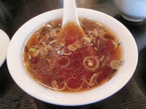 今朝から爽やかだけど、日差しはかなりキツくて夏日だった一日。今からこんなだと、夏本番が怖いかも・・。今年はやっぱりまた暑いのかなあ。今日も帰りがけの途中で昼ごはんを食べて帰ることにしました。ファーストフード系は最近これは、という新商品がないので、どこか適当な場所で、となるのですが、なかなか適当なところが思いつかず。で、手っ取り早く駅からほど近くの日満亭という中華定食屋さんのようなところで食べてみることにしました。昔からあるのは知っていましたが、入るのは初めてです。表に掲げられていたメニューをみると、定番の中華料理のオンパレードに親子丼なんていうのもあって、バリエーションがすごいです。とりあえず中に入ると、もう昭和の中華定食屋さん、って感じのお店。お客さんはまだいませんでしたが、そのあと3組ほどぞろぞろっと入ってきました。席について、置かれていたメニュー表を落ち着いて閲覧。暑かったのでラーメンのようなものは食べたくなかったので、量的にもちょうどよさそうな半チャーハンを食べてみることにしました。そうして待つ事5、6分。最初にチャーハンについていたスープが運ばれてきました。スープ。いわゆるラーメンスープ。うーん、出汁の効き方が弱いかも。続いて運ばれてきたチャーハンがこちら。 半チャーハン。半と言っても女性にはこれで十分なぐらいの量です。見た目しっとり系な感じですが、どうかな?では、実食!!具はなると、叉焼、グリーンピース、卵。食べてみると見た目どおりのしっとり系。というか、ちょっと素人っぽいチャーハンです。火の通り加減が甘い感じがします。塩加減もよく言えば薄味ですが、悪く言えば味がぼやけてしまっていて、もう少し塩なり、醤油なりを足した方が味が締まってよかったと思いました。餃子。ツレがオーダーしたのを一ついただきました。小ぶりサイズで、2つで普通のお店の一つ分ぐらいかな。こちらも家庭的な餃子。にんにくがあまり入ってなかったのはよかったです。ザ・町の中華屋さんっていう感じの中華料理屋さんでしたが、うーん、もう少し美味しいとよかったかな。まあ、ツレの冷やし中華合わせて全部で英世さんお二人でおつりがきてしまうので、それを考えればしょうがないのかなあ、という気もします。また機会があったら、今度はラーメンでも食べてみようと思います。