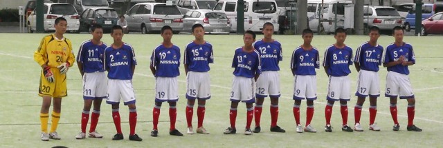 FC日本 1-4 愛媛FC @聖地国立 なんておいしい試合に後ろ髪を引かれつつも、まあちっしー目当ての赤い人たちが大挙して国立には押しかけるだろうから、アマチュアサッカーの聖地楢葉の全日本少年サッカー大会へ行く事に。第1試合が9:30スタートなので、前泊。土曜日の早朝時点でいわきの宿は満室。日本全国48チーム分の選手、スタッフ、父兄、マニア(笑)が集まるから、まあ仕方ないか。楽天トラベルではどこも空いてなかったので、一度は諦めかけたが、Yahooで検索すると奇跡的に湯本に1室だけ空室が。速攻、予約して昨日の夜は湯本で温泉♪午前中に某横浜下部組織サイト管理人さんと合流。全少はいわきや広野からシャトルバスが出る。今回は広野で降りてシャトルバスを利用。らくちん。これ、全クラでもやって欲しいなぁ・・・■新子安U-12 2-0 周防灘FC1試合目は福岡代表の周防灘FC。会場のピッチ1(リスタートはやはりここから!)に到着するとマリノス側はすでにいっぱいだった。空いているベンチに席を確保すると、続々と周防灘の父兄が回りに集ってきて、試合開始前には完全アウェイ(笑) 開始3分、右サイドを駆け上がってきた佐藤君が思い切ったミドル。これがきれいにネットを揺らし、新子安が先制。しかし、激戦区福岡を勝ち上がってきた周防灘も一歩も退かない。前半は互角の戦い。後半4分、宇佐見君が追加点を奪うも、公式記録によると後半新子安のシュートはこれ一本。対する周防灘はシュート5本。喜田君を中心とした集中した守備で周防灘の攻撃をしのぎ、ディフェンディングチャンピオン新子安が緒戦を制した。(写真)3連覇がかかる新子安は日テレの完全密着取材。選手にプレッシャーがかかってそうでちょっとかわいそう。___宇佐見(9)_多田(10)________渡辺(11)______辻(7)__________佐藤(14)______林(12)______高野(5)_喜田(4)_諸石(6)_田中(3)______増田(1)______得点: 後半03分 佐藤 後半04分 宇佐見交代: HT 辻→高城(15) 後半15分 渡辺→齋藤(8)■浦和FC 0-0 芦原SSS埼玉代表浦和FCと福井県代表芦原SSSとの対戦。シュート1本の芦原SSSが集中した守備で浦和FCの猛攻をしのぎきった。浦和FCのシュートは何と32本。打っても打っても弾かれ、絶好のチャンスはことごとく枠を外れる。ある意味壮絶な戦い。■追浜U-12 3-0 豊科南SC追浜の緒戦は長野県代表の豊科南SC。朝方は霧も出てそこそこ過ごしやすかったが、この頃になるとすっかり晴れて猛暑に。2試合目からは給水タイムが設けられた。高梨君の素晴らしいミドル、伊東君の長距離ドリブルからのゴールなど、おっぱまーずらしい魅せるイケイケサッカーで快勝。(写真)給水タイム______伊東(11)______中島(13)__高梨(10)__斎藤(9)_____林(8)_若林(16)___ 小松(5)_伊池(4)_太田(3)_前田(2)_______大手(1)______得点: 前半11分 高梨 後半04分 伊東 後半09分 伊東交代: 後半04分 若林→的早(12) 後半08分 中島、前田→栗原(6)、橋本(14) 後半13分 斎藤、伊東→田中(7)、武(15)Jヴィレは予想通り人で溢れていた(代表には及ばないんだろうけど)。ピッチ3の前には屋台も出ていて、恒例の記念グッズも売っていた。新子安・追浜アベック出場記念にチーム名入りのストラップをそれぞれ購入。某下部組織大物(笑)も、2チーム揃って出ることは滅多にないからと言って何かお買い上げの模様。ちなみに、茨城代表のばらきSCのストラップは早々と売り切れていたようだが、今ブームなん?屋台の前では協賛のデルモンテのお姉さんがバナナを配っていた。しっかり2本ゲット。どうでもいいけど、ホットペッパーはお姉さんの衣装が鹿っぽいのでもらわないんだけど、みんなはどう?(笑)■新子安U-12 8-1 芦原SSS新子安の2試合目の相手は芦原SSS。会場はピッチ8。土手の上から見ると木が邪魔で、土手の下で見るとテントが邪魔。せめてベンチを反対側にすれば、多少は見やすくなるのに。選手の活躍をビデオにおさめたいママさんに、パパさんに、マニアさんは大迷惑(笑) 運営はちょっと考えて欲しい。浦和FCと壮絶な戦いを繰り広げた芦原だが、前半4分に辻君の左サイドからのシュートをGKがファンブルして失点。7分には宇佐見君のミドル、8分には佐藤君(いいクロッサー!)のクロスを多田君のバックヘッドが決まり、あっさり3-0に。3-0のスコアに、新子安ベンチからは「点数は関係ないぞ!(最後まで気を抜くな)」との声。後半も新子安が点を重ね8-1の快勝。ただ、気の緩みからの1失点はちょっと反省ポイント。(写真)新子安U-12 2006 三脚邪魔。ごめんね、野山君。___宇佐見(9)_多田(10)________渡辺(11)______辻(7)__________佐藤(14)______林(12)______高野(5)_喜田(4)_諸石(6)_田中(3)______増田(1)______得点: 前半04分 辻 前半07分 宇佐見 前半08分 多田 後半01分 喜田 後半02分 浜川 後半05分 (豊科南:姉嵜) 後半07分 野山 後半10分 高城 後半19分 喜田交代: 後半11分 宇佐見→高城(15) 後半15分 田中→原田(13)■追浜U-12 5-0 小針レオレオSS引き続き、同じピッチで追浜の2試合目。対戦相手は、仙台代表小針レオレオSS。試合開始直後、高梨君のCKを林君が頭で合わせ追浜が