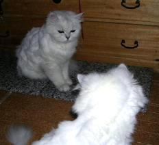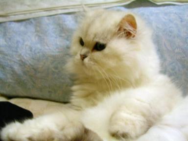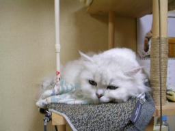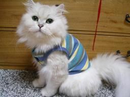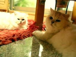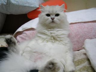 『一人で研げるもん』小吉に何度か爪とぎの使い方を教えてもらい、初めて一人でできました(^^)安心したのか、小吉は今までどおりベッドの角で磨いでいる。(オイオイ)クリームシチューの幽霊の番組を見ていた。放送開始10分後くらいから見だした私は、ずっと幽霊の番組だと思っていた。私はお化けが怖い。実家に居るころは、よく夜のトイレには前の部屋の兄貴を起こし、廊下に居てもらった。(トイレは私の部屋の傍なのだが)したがって、一人暮らしも長くは続かないだろうと言われていた(かれこれ13年だが)今は怖い夢を見ても、猫たちが平穏なら安心できるようになっているが・・(洋画で猫が人間より先に霊に気付いていたので、そうかなと思い)心霊写真や防犯カメラなどの映像はまだ我慢できていたが、友近氏のレポートのあたりから急に怖くなってきた。ただ、有田氏の『白い犬』発言で“笑いかドラマか?”と思えるようになっていた。部屋の中で、変な声がしだした。ゾォォォッとして、見回すと、小吉と梅吉の寝息だった。散発してすっきりしたのか、とってものびのびの梅吉 ちょっと散発した小吉 (2匹とも、首の周りの毛を刈るととても活発になる。チンチラなのに・・・)しかし、やはり怖いものである。女の子の霊が画面に映って消えたときは、さすがにゾクッとした。『あかん、これやったら夜中寝られへんさかい、ビールでも飲みましょ』とあまり冷えてないビールを飲みながら、見続けた(怖かったら見るなよ!)除霊のおじさんも疑わしかった。沢山の幽霊番組は見ているが、ちょっと除霊がお粗末だった。確信したのは、押し入れから“水”が出たときだった。『ここまできたら、ドッキリかドラマで終わらなあかんわな』このあたりからは怖くもなく、寝る準備をしだした。『うらめしやぁ~』カメラを向けると、いきなり手を上げて構えだした梅吉。私を怖がらそうと言うのか?結局ドラマであっけない終わり方だったが、最初のほうはドキドキハラハして見れたので、まぁ良かったかな?で、ドキドキハラハラしすぎて、洗濯するの忘れた(^^;)食卓に置かれるまでじっと“待て”をしておかわりを待っている(散髪前の)小吉(左)、梅吉(右)小吉はじっとお座りをしている 『まだなのぉ?』