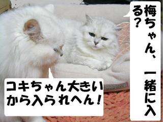連休があったため、給与支給が早かった12月。支払や預入を済ませた後日、財布を見ると高額紙幣が入っていた。『自分の物何も買ってないしなぁ』等と思いながら、2にゃんのタオルとフードを追加購入し、『これでばっちり!』等と余裕綽綽な通勤と中に青ざめた。“定期券、買っていない・・・”2週間前からしか継続購入できないため、24日に買う予定だったのを忘れていた。結局、定期代を使い込んだ梅之輔。うぅ!家に帰ると、小吉のベッドで、お膳に置いていたサボテンが寝ていた。お膳の端にあった化粧水はそのままだ。砂は固めてあるので害は無いが、何か意味があるのだろうか?君たちは、どんな一年でしたか? 無理矢理座らせています♪ 何気無く、当たり前に時を重ねて、理不尽な対応が続き、そうするとミスも増え、『会社を辞めよう』等と思った春。退職希望を告げぬまま転職活動をし、現在より好条件での採用を数社からいただいた。いざ、となると、これから築く人間関係・・・しかも梅之輔より年下の女子との交友関係。そう思うと後込みをし、転職をあきらめた夏。“今は時期ではないのかも”と居るなら居るで、少し自分を省みようと思った夏。休みも増え、気持ちにゆとりができた時、ふと自分を見つめてみた。そこには、“おごり”“うぬぼれ”“意味の無い自信”が垣間見えたような気がした。当たり前の毎日の中で、自分を省みることを忘れていた。もう一度、働き出した頃の気持ちに戻ってみよう(無理だが)とまず、敬語から直してみた。社内で、人の前で急に直すことは少し恥ずかしく抵抗もあったが、やってみた。そんな小さな事をいろいろとを重ねて数日後、少しずつ、上司の態度も変わってきた。そこからは、いろんなことがスムーズに行きだした。そうすると自分でも少し仕事が楽しくなってきた。これは仕事だけではなく生きていく事にも当てはまるのではないだろうかと考えた秋。ためしに受けた秘書検定。確かに合格率の高い試験だが、梅之輔にとっては学ぶべきことが多かった。問題として出るときちんと解答はできるのだが、あらためて文字として読むと事務員として、知っているのに出来ていない事の多さに愕然とした。そこからは、学び、思い出し、態度を改めると上司の態度も変わった。敬うこと、感謝すること。今まで梅之輔には無かったような気がする。仕事だけではなく、生活においても少し気持ちが楽になった2005年。敬うこと、感謝すること。母から受けていたさまざまな愛情にもやっと気付き、心が少し穏やかになった。日常でも、とても穏やかな気持ちでいることの出来た冬そして、今までさまざまな人たちに支えられてきた事を実感した大人になりきれていない梅之輔。当たり前のことかもしれない。今更考える事ではないのかもしれない。でも、気付かずに過ごすより今更でも気付いたほうが良かったと思う。今年だけではなく来年も何かを気付き、学び、意味のある日々を送りたい。梅之輔にとってこの一年は、とても大切で、内容のある重い一年だった。嬉しかったのは、公開されることも知らずにはじめた日記(ブログ)にたくさんの方が訪問してくださり、書き込みをしてくださる方が少しずつ増えたこと。忙しくても、出来るだけ日々のたわいの無い出来事を更新して行こうと思います。 最後に・・・ さまざまな犯罪が起こり、住みにくくなって来た日本。来年はどうなるかと考えながら、2にゃんが元気でいてくれるようにがんばろうと考えた。梅之輔にとっても、小吉と梅吉にとっても、そして皆さんにとっても、2006年がよい一年でありますように。次の更新は1月4or5日になります。では、よいお年をお迎えください(^0^)/
