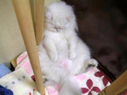 洗濯物を干すのも取り込むのもおっくぅな季節。それでも小吉は毎日ベランダへと出たがる。寒いので、小吉を出したら部屋に戻りサッシを閉める。部屋の中からすりガラスに映った小吉を見ている。気が済むと、サッシの前に座って開けてくれるのを待つ小吉。たまに気が付かないフリをしていると、大きく伸び上がりアピールをする。憂い奴じゃ。梅吉に残りのご飯を食べさせようと一緒ににゃん食卓へ向かうと、“ご飯が足りない”と座り込んでいた小吉が姿勢をただし精一杯の可愛い顔でこちらを見たこの顔をされると負けてしまう梅之輔・・・少し前、ホームセンターでゴミ袋などの生活用品の買出しを終え、カートを押しながら自転車置き場に戻って来た時『ガーン!』なんと、10台ほどの自転車が将棋倒しになっている。しかも、坂道の一番下に梅之輔の自転車が・・・『ウリャッ』等と言いながら自分の自転車を引っ張り出していると、どこからともなく髪の毛を金色や赤色、白色に染め、所々破れたジーンズのすそを引きずり、鼻ににピアスを開けた若者達がこちらに向かってやってきた。“何?何?お金は今使って持ってないわよ”と立ち上がってカートを握りしめていると・・・若者たちは、将棋倒しになった自転車を一番上から立てていた。“もしかしてこの子達の自転車?”等と思いながらボーゼンとしていると、最後に私の自転車を立てて『ハイ♪』と渡して、もと来た方向に去っていった。“助けてくれたんだ♪”と気付き『ありがとうございました』と軽く頭を下げながら言うと、一人だけ居た女の子が振り返り“ニコッ”っと、とてもさわやかな笑顔を見せた。自分の自転車だけを引っ張り出そうとしていた自分が恥ずかしくなった(^^;)最近の若者は・・・などとよく言われているが、ちょっぴり嬉しい気持ちで帰路に着いた。鏡餅(かがみもち)梅吉を撮っていた時・・・・鏡餅に見えてしまった(^^;)すっかりベッドが気に入った小吉。買った甲斐があったようだ♪梅吉君、なぜ君はそんなに足が開くのかな? そういえば、テレビで見たオラウータンの赤ちゃんもこんな座り方をしていた。やっぱり、猿?雪による事故や交通のマヒなどがニュースで流れる今日この頃。雪降らないかなぁ~なんていっている場合じゃないな。寒くなりそうな週末。皆様、病気、怪我にお気をつけください。では、火曜日にお会いしましょう。