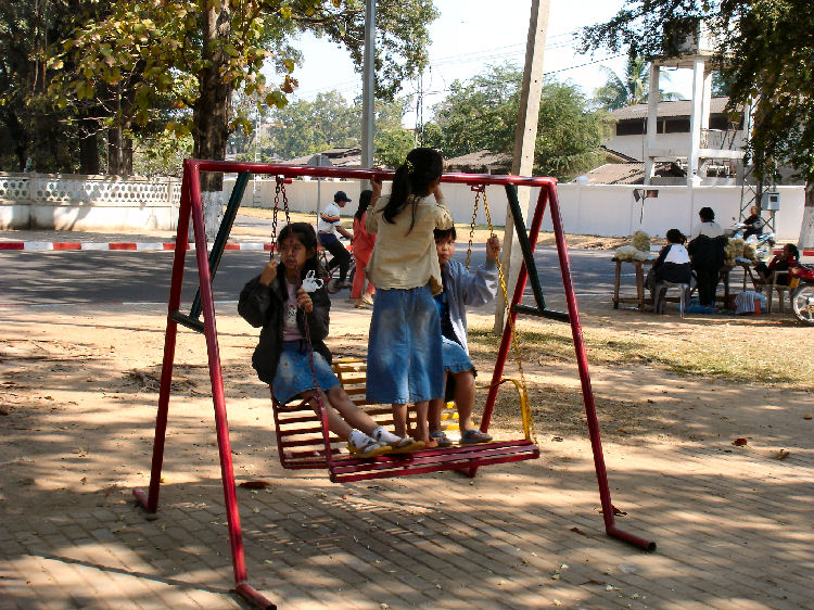 昨日まで,ラオスの首都ヴィエンチャンのメコン川沿いの大工事についてUPした。 それに付随して,もう1件UPする。横にある公園だ。 「ランサン・ホテル」(ホテルレビューは,ここをクリックで見られます!)から通りを隔てたメコン川手前に,小さな公園がある。地元人用で,特にどうと言うような公園ではない。 メコン川沿いの大工事とともに,ここも手が加えられていた。 まず,以前の様子は… ’05年の様子。 VTRでは,’00年から撮っていたはずだが,デジカメでは’05年からになる。 ’09年8月。 小さい子連れのお母さんたちが集まっているところは,日本の公園と同じかも知れない! メコン川の方向を見る。以前は,木や草が生い茂っていたが,すでに工事が始まり,更地になっていた。 めずらしく?公衆トイレもある。有料だ。ラオスに限らず,トイレは有料のことが多い。最近は,各国ともに事情が変わってきている。 ’09年12月。 並んでいるブランコに座っているのは,多くが男性の大人だ(^_^;)公園には,以前から男性の大人も多く座っている。 子どもも多いが,夕方になると,多くの大人がベンチに座ったりして休憩に来ていた。 左向こうに見える建物が,「ランサン・ホテル」だ。 ’12年1月。川沿いの工事が進んだときに,この公園は… おっと!感じが変わっている。何やら,器具があるな。 ジムにあるような,筋トレのマシンだ。 何種類もある。自由に使える。 1つ1つに説明書が書いてあるのだが,全て英語だ。ここは地元人が中心で,外国人なんて少ないのだが… マシンは輸入物で,英語版しかなかったんかな? いっぱいあるが,使ってる人は見なかった… 以前の遊具も,いくつかは,そのまま残されていた。 以前と変わらない光景が広がる。 あれ?トイレは有料のままのようだ。1回,2000キープ(約20円)だ。 向こうの方の屋台街に,新設されたきれいな最新式(便器も蛇口も自動センサー付き)のトイレは無料なんやけどな…(>_