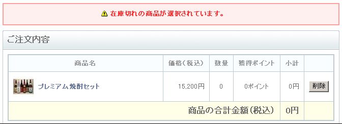 2012年11月14日22時00分から販売開始「毎月人気の魔王セット」に比べてお得感がありましたので、久しぶりに狙ってみました。結構、ショッピングカートには入るんです。でも、そのあと「購入」ボタンを押したときには、無情の「在庫切れ」です。12月の魔王単品販売もおそらく同じ結果でしょうね。(半年前も健闘しましたが、結果は…)プレミアム焼酎セット 価格:15,200円(税込、送料別) (よろしければクリックお願いします。)