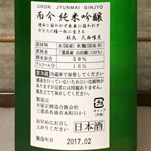 (2017年詰!今期物)而今 純米吟醸 山田錦 無濾過生 720ml【木屋正酒造】【三重県 日本酒】