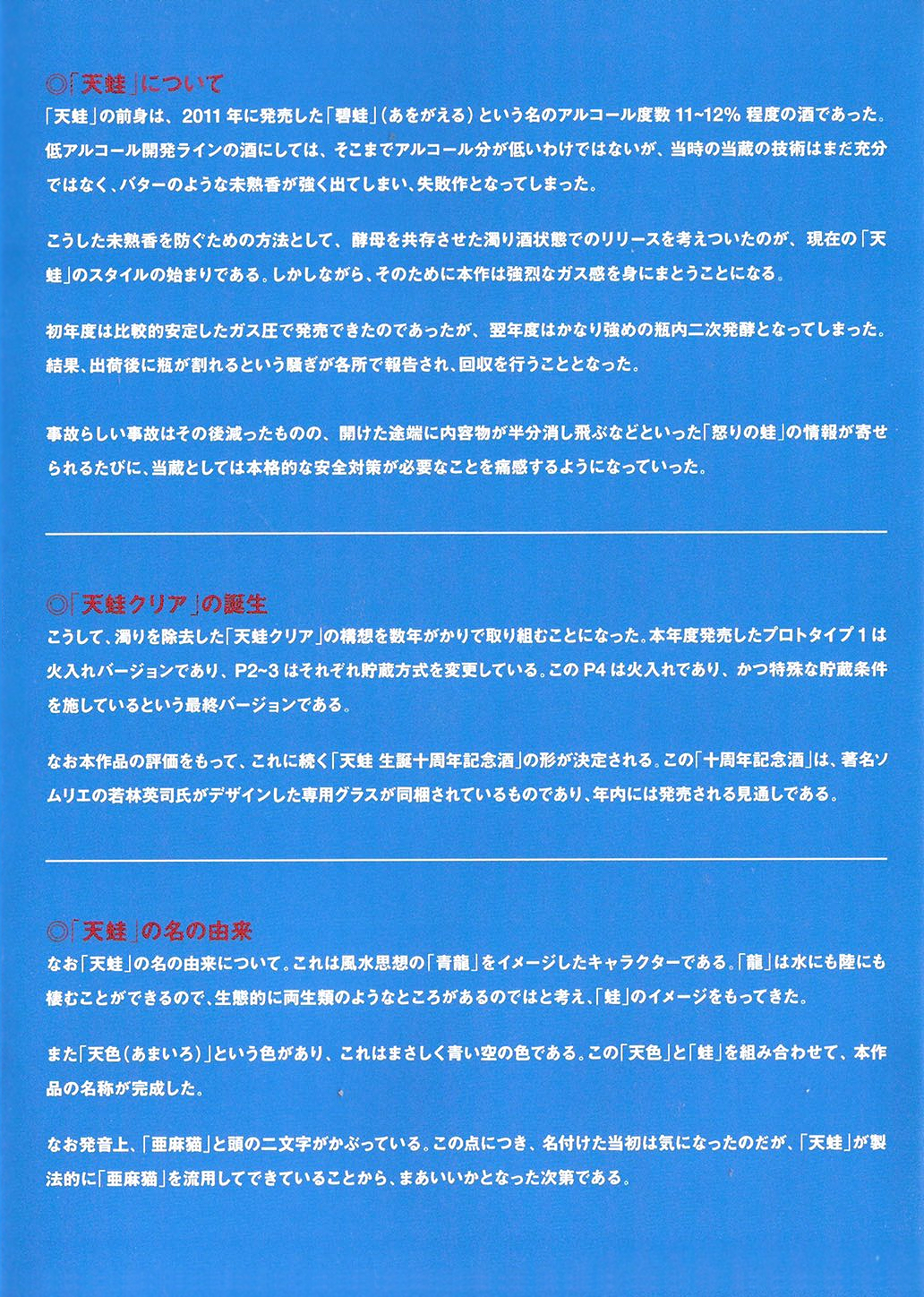 こうして、濁りを除去した 「天蛙クリア」の構想を数年がかりで取り組むことになった。 本年度発売したプロトタイプ1は火入れバージョンであり、P2~3はそれぞれ貯蔵方式を変更している。 このP4は火入れであり、かつ特殊な貯蔵条件を施しているという最終バージョンである。