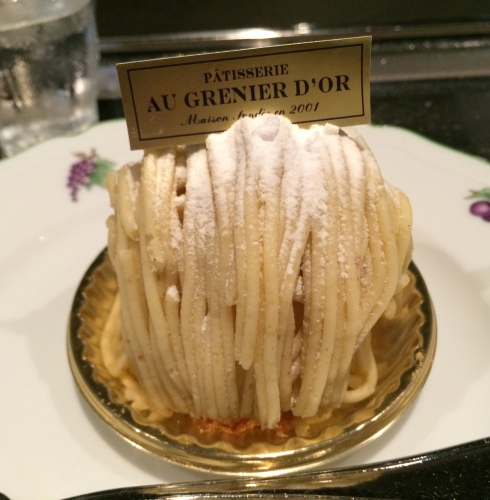 錦市場メイン通りからすぐのところにあるサロン・ド・テ オ・グルニエ・ドール。テイクアウトのお店はちょくちょく利用していましたが、サロンは初めて。午後1時すぎに入店しましたがすでに3組の待ち。待ち時間のあいだに今日のケーキを選択。紅玉のリンゴタルトに心惹かれましたが、モンブランに決定。暫くして案内された、店舗奥の離れは古民家風の落ち着いた雰囲気。京都観光が初めての東京からの友人にも楽しんでもらえた様子。ごちそうさまでした〜!