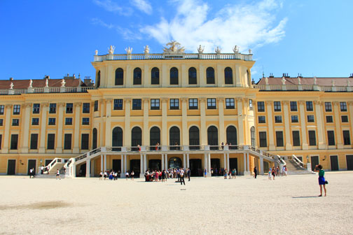 7月16日昨日、シュラトミングからザルツブルクを経由して高速道路でウィーンに入った。今日はシェーンブルン宮殿の庭園での演奏が行われる。日本にいた時の週間予報では今日のウィーンは雨の予報で心配していたのだけど、どれだけ晴れ男、晴れ女がいたかわからないが見事な青空に恵まれることになった。日陰は涼しいがひなたはとても暑い。ここでの演奏が今回の旅行での最後の演奏になるのだが、和気あいあいと準備も進む。映画音楽やPOPS、JAZZタイムなどを取り混ぜて、ここでの演奏時間も約1時間。きっと先生は最後の曲にアイネ・クライネ・ナハトムジークを選ぶだろうと娘から聞いていた。曲はその日の演奏の前におおよそ先生が決めてメンバーには直前に知らせるらしい。いよいよアイネ・クライネ・ナハトムジークが始まると、あ~これで最後だなぁと思いながら聴いていた。演奏が終わると観客からは懸命に演奏した彼らに大きな声援と拍手が送られた。礼を終えた先生がバンドメンバーに何やら話しかけている。あわててメンバーが譜面を準備している。どうももう一曲やるようだ。演奏が始まった。なんとT-SQUAREのOMENS OF LOVE!娘が是非やりたいと言っていた曲。T-SQUAREの曲がオーストリアで聴かれていたかどうかは解らないが、演奏している彼らがとても楽しそうだった。こうしてシェーンブルン宮殿での演奏は彼らの好きな曲を最後に無事に終了した。シェーンブルン宮殿の庭園側正面この宮殿、あのハプスブルグ家の夏の離宮として使われた宮殿だそうで部屋数が1,441もあるそうな。モーツアァルトがマリーアントワネットに求婚したという鏡の間があったりする。ウィーンフィルも演奏するという宮殿正面前の広場で演奏宮殿の前には皇太子庭園が広がりその奥にはグロリエッテというマリアテレジアの命で建造された凱旋門が見える。