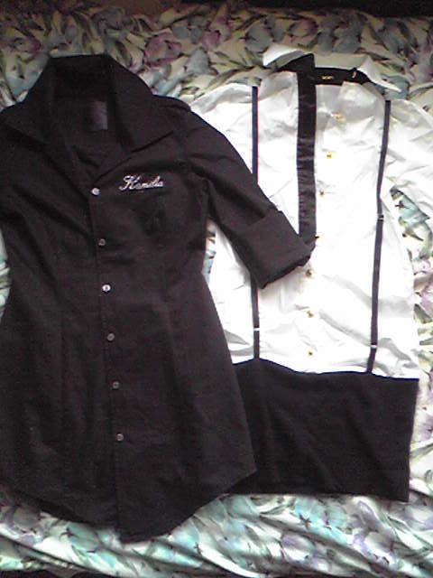自分でもシャツがブーム!これは両方ともオクだよv黒い方はマウジーので新品¥3000でサスペのはノーブランド新品¥990♪左はチャックでオフショル調節できるやつ♪オクで¥1200だよ右のはニットベスト!夢展望さんで買った!画像消えちゃたー・・・