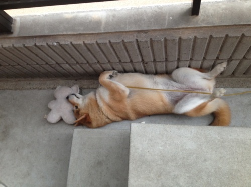 ほぼ室内犬ウランです。 この方、基本かまわれるのが嫌いだし へそ天も見てる前ではしないし 近づくとやめてしまうことが多いです。 寝る前には係留ワイヤーにつなぐんですが 決まってここでへそ天 冷蔵庫が冷たくてきもちいいんでしょうか・・・ 外が気になるなら外へ行けばいいのにねぇ・・・