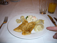 バスに揺られている間は、ただただ、体力温存。できる限り悪化しないように。行きもバスを止め、帰りも、なんてさすがにねぇ。座席でうずくまって寝ていた。八ちゃんも寝るのは好きなので二人して寝てた。が、当然ながら、他のメンバー達は元気。中でもモンゴル人ガイドの二人は、なぜか行きよりも元気。マイクで歌合戦(というか、最後はオンステージに近い)が始まり、「そこの二人はなぜ歌わない?!」と責められる始末。とはいえ、こんなところで、しかもそんなことで体力を消耗しては!!!!途中、みんなの希望もあり、モンゴルの名産品「カシミア」工場へ立ち寄り。確かに、カシミア製品を何か買って帰ろうとは思ってました。幸い、体調もなんとか小康状態を保っていたし、途中下車すればトイレも行ける。ということで、私もバスの外へ。まずはカシミア製品よりもトイレへ直行。電気が壊れてて、ドアを閉めると真っ暗になる個室だったけど、今の私にはそんなことはちっちゃいこと。トイレに自由に行けること自体がとてもありがたく、安心できる。もちろん、カシミアのセーターも購入。工場直営店だけあって数多くの商品が並んでいた。ストールやマフラーはお土産にはちょうどよかったが、あいにく私の周りにはあまりそれらをする人はいないので、その代わりに父にカシミヤの靴下をお土産として購入。寒い夜の釣りにちょうどよいかな、と。ちなみに、会計では、VISAカードが使え、現金ならドルも円もOKだった。なんとか昼過ぎにホテルに到着。モンゴル到着初日に午前中だけ仮眠をしたホテル。予定より少し到着が遅れたらしく、とりあえずバスは私たちをホテルで降ろし、午後の馬頭琴工場見学ツアーに行く方々を連れて行った。次の集合時間は14:00。それからみんなで昼食に行く予定。部屋の鍵をもらって、部屋へ入る。・・・ぐったり。すぐに横になった。集合時間まで約1時間。それまではゆっくりしよう、と。一緒にいる八ちゃんには申し訳なかったが、ぐうたら旅行タイプの私たちだから許してね、と思いつつ。本当は昼食は遠慮したかった。でも「具合が悪いのでキャンセル」することで、他の参加者に不安感を与えるような気がして、予定通り参加。昼食会場はウランバートルのホテルのレストラン。小奇麗なレストランだったけど、既に何を口にするのも怖い状態。それにしても、嘔吐と下痢と発熱・・・この食あたりの原因はなんだろう。しかも他のみんなの様子は変わらない。八ちゃんも変わらない。ということは私だけ?私だけが食べたものってなんだろう・・・。そんなことを考えながら、出てきた料理をちょっとだけ口にして時間を過ごした。但し、生野菜には一切手をつけず。コワイ、コワイ、と心でつぶやきながら。せっかくのモンゴル名物料理も、馬頭琴の生演奏やホーミーの生歌も心からは堪能できず、残念そんな時・・・中座してトイレから戻った八ちゃんが一言「私もなんだかおかしい」かくして、私たちの災難第2弾がスタートした。 (写真左:モンゴル名物ポーズ(中国の包子に由来する蒸し肉餃子)、写真右:ホーミー歌手。一度に複数の旋律を一人の声で奏でる。驚嘆!)