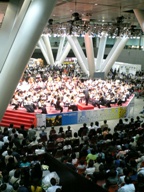 ラ・フォル・ジュルネ「熱狂の日」音楽祭2007に行ってきました。今年で10年目(らしい)のクラシック音楽のイベント。私も今年初めて知ったんだけど、クラシックファンに人気で、ちょうどGW期間中ということもあり、チケットはあっという間に無くなっちゃうとか。それで100万人近い来場者を集めるんだからすごい!で、今年はチケットが手に入ったこともあり、行ってみることに。ただ、一緒に行くはずだった友人が体調不良で行けず、やむを得ず一人で。コンサートホールに入る前に展示会場へ寄ってみた。ここには、コンサートチケットを持ってる人だけが入場できる場所。イベントなのに、そんなCLOSED でいいのか、と思ったけど行ってみて納得。展示会場でも中央でオーケストラがコンサートをやってたり、ブースではテレビにも出てる、あの青島先生が講演をしてたり…。つまり、クラシックファンはもちろん、クラシック初心者の人も楽しめる空間だったのです。だから、最終日の夕方なのに、私と同じ夜公演のお客さんなのか、会場は大賑わいで立見まで。コンサート以外でも充分に楽しめる感じ。実際のコンサートも大きな会場は満席。演目も割と有名なものが多く、普段クラシックに縁のない人でも「あ!聞いたことある!」って嬉しくなりそう。何より、イベントだから正装でなくても平気だから、カジュアルな恰好で気軽な感じで来てる人が多かったなぁ。でも、演奏は本物!(少なくとも私は大満足!音楽って心で感じて楽しむことでしょ)あんな風に気軽に本物のクラシックに触れるのはオススメだな。来年も行ってみようかな。(写真:展示会場のコンサートの様子)