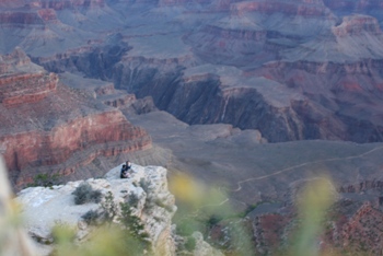 朝陽鑑賞スポットは、ヤバパイポイント。せっかくの早起き、せっかくのグランドキャニオン。ちょっとでもいい場所で見たい!駐車場には幸い車は見えない。よしっ!小さくガッツポーズ。車を降りるなりビューポイントへダッシュ!誰もいない。よっし!ガッツポーズ!「誰もいませんよ~」ビューポイントの先頭のスポットに腰掛けようとしたら、その下に更に突端が見える。そこの方が、朝陽がよく見えそう。「あそこに行きたい!」お酒の勢いって怖い。今思えば、間違いなくお酒の力だ。道なき道を、すたすたっと進み、ビューポイントより先の突端へ。この時には、公園のあちこちにある「落ちるぞ!」という警告の看板なんて忘れてる。ただただ、よりいい場所で朝陽を見たい。朝陽に近づきたい。その思いだけ。(写真:ここが、私達のベストスポット。まさに浮いてる感じ。ビューポイントから撮影。ちっちゃい点みたいなのが、私達)気づくと、ビューポイントには人が増えていた。「今頃来ても遅いのよぉ~」ビューポイントで見ていたJさんから後で聞いた話では若い外国人のカップルが、どうやら私達のスポットを昨日から狙ってたらしく私達が、そこに既に陣取ってるのを見て、「Oh!サムライ達め!」と、えらく悔しがってたとか。「今頃来ても遅いのよぉ~、怠け者達~」こっちは、1時間半しか寝ずに一番乗りしたんだから。さてさて、それからは、少しずつ、変わっていく空の色をただただ眺める時間。朝陽が昇り終えると、少しずつ観光客は消えていく。特に日本人のグループ観光客の多くは、その後のスケジュールがあるから、日が昇る瞬間を見たら急いで帰っちゃうんだとか。もったいない!!!だって、朝陽が昇る時だけじゃなくて、少しずつ日が高くなっていくにつれて、光のさし方が変わって、グランドキャニオンの表情も刻々と変わる。これを見ないなんて。私達はたっぷりその時間を楽しんで、朝食へ。朝ごはんはロッジの食堂で。好きなものをピックアップして最後に清算するビュッフェ方式。ポテトにブリトー、ミルクとコーヒー。山小屋の朝ごはんって感じのチョイスになりました。
