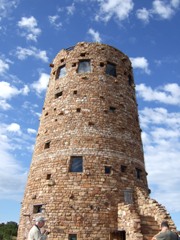 (忙しくて書き込みをサボってたら、8月の書き込みができなくなってしまった・・・日付がずれてます。すみません)私は、無類の雨女だと自覚してます。高校の卒業式までずーっと雨だった。今でも実家に帰ると8割は雨「さっきまで晴天だったのに、飛行機が着いた途端に大雨よ!」と両親はすっかり慣れた様子。それでも、時々は晴れ男や晴れ女に助けられて、事なきを得、満喫できることもある。ところが!よりによって、この大自然、グランドキャニオンでその無敵ぶりを発揮することになろうとは・・・ヤバパイポイントの後、“ビレッジ”と呼ばれる、グランドキャニオンの中心にある“ブライトエンジェル”のビューポイントに。この付近には鉄道の駅があったり、日本の天皇も宿泊したとされる著名人やVIPが来た時に必ず泊まると言われる「エルトバーホテル」がある。100年以上の歴史を持つ、有名なホテル(当然、高いんだろうなぁ)。(写真:エルトバーホテルのロビー)で、ここを境に、ウエストリム、イーストリムと分かれてる。このブライトエンジェルはトレイル(散歩道?にしてはハードすぎる。登山道、とでも言うのかな)の出発点。全部は上がれないまでも、ちょっと途中まで。せっかくだから、トレイルもどきをしてみよう、と道を進んだ。ちょっと進んだだけでも、展望台でもない、地上でもない、グランドキャニオンのまさに「途中」に立っている気分。人が1組すれ違えるくらいの狭い道だから余計のそう思えるのかも。帰りは行きの倍以上の時間、体力が必要らしい。そんな話をしてると、WARNINGの看板が!「日帰りで、トレイルをしようと思わないで。死んじゃうよ」みたいなことが書いてある・・・。くわばら、くわばら。そんなに大変なんだね・・・そうならないように、ともと来た道を早々に戻ることに。ま、200メートルは進んだかな~。夕日の時間も近づいてきたので。夕日は、マーサーポイントで、と移動はしてみたものの、空模様が怪しい。あぁぁ~、やってしまった。私の雨女力をこの場で、しかもこんなタイミングで発揮することになろうとは!雨雲探しがすっかり得意になってた私にとっては、これからやってくる雨がどんな強烈なものかは容易に想像できた。雲の様子をじっと見ていた自称晴れ男のJさんが「よし!もっと西へ行こう。あの雲の向こうへ行けばいいんだ!」と。車で急ぎ西へ向かう一行。ところが、雲はどんどん厚くなり、ポツポツと雨も降ってきた。ホントにこのままいけば、切れ間にたどり着けるのか??と思っていると「あ!エルクだ!!!」大興奮のJさん。グランドキャニオンには何百回(もしかしたら、更に桁数があがるかも!)来てるJさんがこんなに興奮するものって???一気に、「今夜の夕陽は諦めよう」という結論になり、慌ててUターンして見たものは、エルク=大角鹿の群れ。文字通り大きな角を持った鹿からまだ子供だろう鹿まで数頭がすぐ目の前にいた。日暮れ間近とはいえ、明るい時間に人里近くにくることはとっても珍しいことらしい。その雄雄しい姿。カッコイイ。野生動物の荒々しさより、気高さが感じられる。(動画:グランドキャニオンの野生動物たち)実はこの日は、八ちゃんの誕生日。旅行前に、KさんとJさんには「一緒にお祝いしてくださいね」とお願いしていた。すると、さすが!園内のエルトバーホテルの予約をしてると言うではないか!ん~、アメリカに住む大人の男性は違うわ~、と感動してレストランへ!ここでも、アメリカの食の進歩にびっくり。いやぁ、アメリカよ、よくぞ味覚が成長してくれました。ワインはその名も「GRAND CANYON」。赤です。ホテルへ戻れば、NAPAのワインを用意してくれてる、ということで、レストランでは1本でガマン。美味しい食事と美味しいワイン。グランドキャニオンで、思いがけない時間。思わず八ちゃんに言いました。「八ちゃん、誕生日ありがとぉ~」だって、八ちゃんが誕生日だったから、私までこんないい思いができたんだもん。