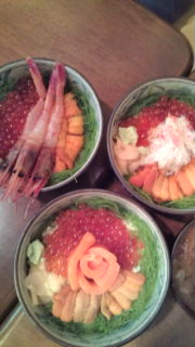 深夜のラーメン屋で、お客さんやお店のおじさんと急遽、観光計画会議。「函館までは片道4時間かかるよ」「支笏湖はきれい。グラスボートに乗るといい」「定山渓で温泉は?」いやぁ、袖ふれあうも多生の縁、とは、こういうことね。というわけで、二日目は、小樽&支笏湖プランに。古い石造りの建物や、運河の流れる小樽。風情ある街並みを歩きながらの話題は、もちろん高尚な文学!なわけはなく、「昼ご飯、何にする?」「お腹すいたね」「丼ものがいい!」「夜、何食べる?」胃から生まれたんじゃない?!これでもアラフォーなんですが、強靭な胃袋です。到着して、まず食べるところを求めて散策。前夜が寿司だったから、イメージは海鮮丼。いくらとうに、たっぷりの。ほら・・・こんな感じ!!!3品おまかせ丼!みんな、うにといくらははずせず、最後の一品だけカニ、サーモン、えび、とこだわりをみせました。いやぁ、美味しい。ホントに、文字通り、ペロッとあっという間にたいらげちゃったご飯粒は少なめで、腹5分くらいかな。食べたいものがいっぱいの私達には、調度いい腹加減。「これなら、とうもろこしも食べれるね!」次なる目標に向かって店を出たのでした。向かうところ敵なし!です。