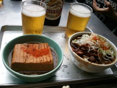トーマス姉妹と築地巡りに行ってきました!トーマス達は、時々姉妹で築地に出かけてるようで、美味しいお店やお得情報に詳しい。今日は、買い物よりも食べ歩きが目的!時間は12:00ちょっと前。いい感じにお腹がすいてきて、胃袋の準備万端!まずは、「きつねや」のホルモン煮。前からトーマスから噂は聞いてた。厳しいおばあさんがいて、料理のシェアを許しちゃくれないんだとか。ホルモン煮も、単品はダメで、ご飯かお酒と一緒に注文しなくちゃいけないルール。そんなわけで、絶品と噂のホルモン煮と焼き豆腐とビールを注文。今日はたまたまその厳しいおばあちゃんは不在で、カウンター内の大きな鍋のかき混ぜと注文対応のご夫婦だけ。なので、厳しいチェックを免れて、3人でこの注文。最初っからたくさん食べたら、このあと楽しめないからね道端の台でいただきま~す!よ~く煮込まれた濃厚なホルモン煮。ビールによくあう。焼き豆腐も、よ~く味が染みてて、ぷるんとした食感でGOOD!早くも大満足さぁ!築地めぐりスタート!続いては、魚介店前でおいしそうに焼かれる牡蠣とハマグリ。大好きな牡蠣と、珍しいハマグリと・・・悩んだ挙句、私とマードック(トーマス妹さん)は牡蠣を、トーマスはハマグリをオーダー。焼かれる間は缶ビールを飲みながら待機。焼き場の隣に、イカ飯発見!イカ飯・・・よく駅弁大会に出てるけど、なんだかそれより大ぶりで美味しそう♪「三等分してくれますか?」大将にお願いして、イカ飯2個を三等分。もち米と普通の米を配合してるのか、もちもちすぎず、軽い感じ。これもGOOD!当然ながら焼き牡蠣もサイコー海のミルクがた~っぷりまたフラフラしてると、今度は生ガキを発見!爪楊枝を刺された牡蠣が店先に並んでる。えへっ「これ、選んでもいいんですか???」並んだ牡蠣から自分の好みの大きさのものをチョイスして、一口でパクリ日本の牡蠣って、どうしてこんなにクリーミーなんでしょう!!美味しすぎる・・・んでまた試食をしながらプラプラと。しめはラーメンきつねやの並びに行列のあった「井上」へ。昼より列も短くなってて、ほぼ店じまい前。スープは東京しょうゆ。麺はちょっと細め。何か特徴があるわけではないけど素朴でやさしいラーメン。チャーシューいっぱい。最後だから気前よく入れてくれたのか、たっぷり6枚ほど。3人で1つのラーメンをシェア。隣の台には、到着時にきつねやでも一緒だった外国人グループが。同じくらいのタイミングで築地巡りをしてたのかな?う~~ん!満腹~~~!!